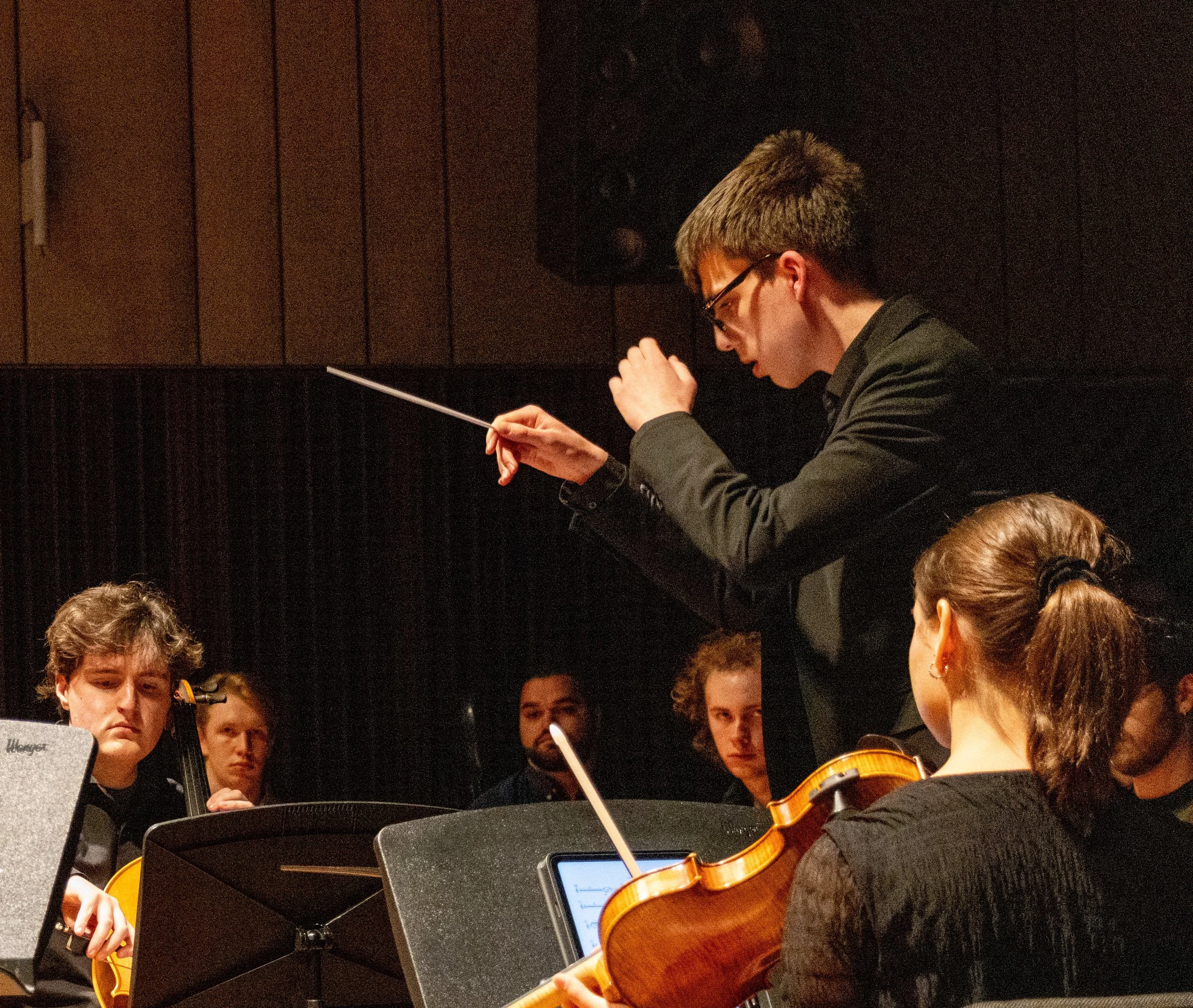 Opportunities to bring together his composition and conducting worlds are of special interest to Brown. He frequently assists fellow student composers in bringing their works to the stage, taking up the baton in October 2024 to lead Benjamin Muir’s “Turbulence” for orchestra and, in March 2025, Max Allard’s “Banjo Concerto”.