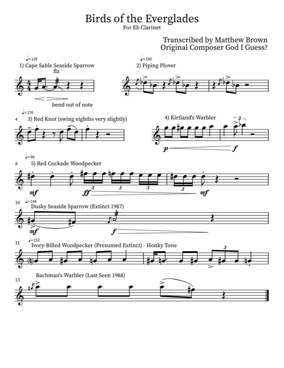 As an environmental policy lawyer for the US government, my father has spent three decades working to protect these birds. In doing so, he has helped me appreciate their beauty as well as their struggle. This piece draws on that inspiration and incorporates the calls of six endangered species found in the park: Cape Sable Seaside Sparrow, Piping Plover, Red Knot, Kirtland’s Warbler, Red-cockaded Woodpecker, and Everglade Snail Kite. The calls are layered and transformed with increasing intensity to bring the listener into the birds’ habitat and convey the need for action. An additional melodic motif for the beauty of the landscape unites this material. The pensive ending uses the calls of three extinct birds that once lived in the Everglades – Bachman’s Warbler, Dusky Seaside Sparrow, and Ivory-billed Woodpecker – providing a wary reminder of what indifference to endangered species can cause.