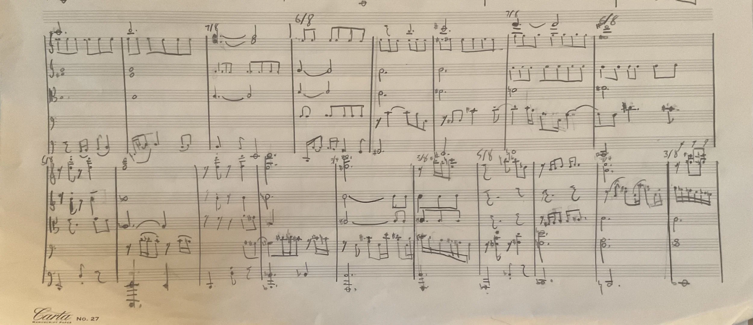And what about “Reel”? This piece also serves as an homage to my composition instructor and favorite moonlighting folk musician, Jesse Jones. It engages his proclivity for 9/16 fiddle riffs, as well as a certain metric grid technique he taught me: I employ a 25-eighth note cycle divided simultaneously into both 6+6+6+7 and 5+5+5+5+5. “Reel Rebellion” sits beside my mixed septet “Rat Race” (also 2024) in both its playful focus on groove and the alphabet.